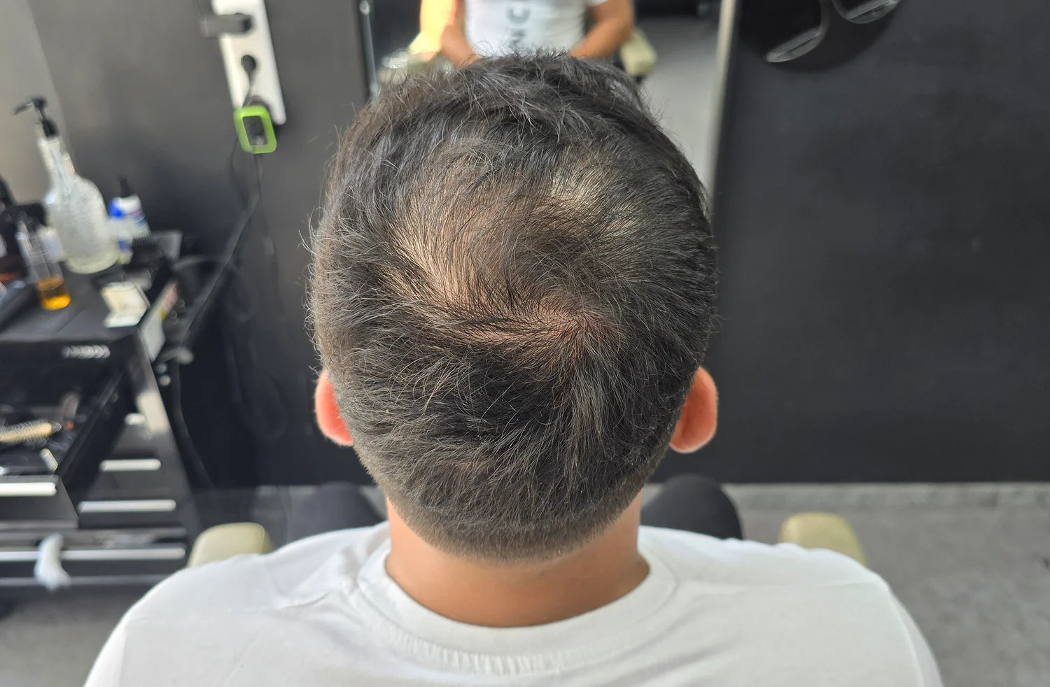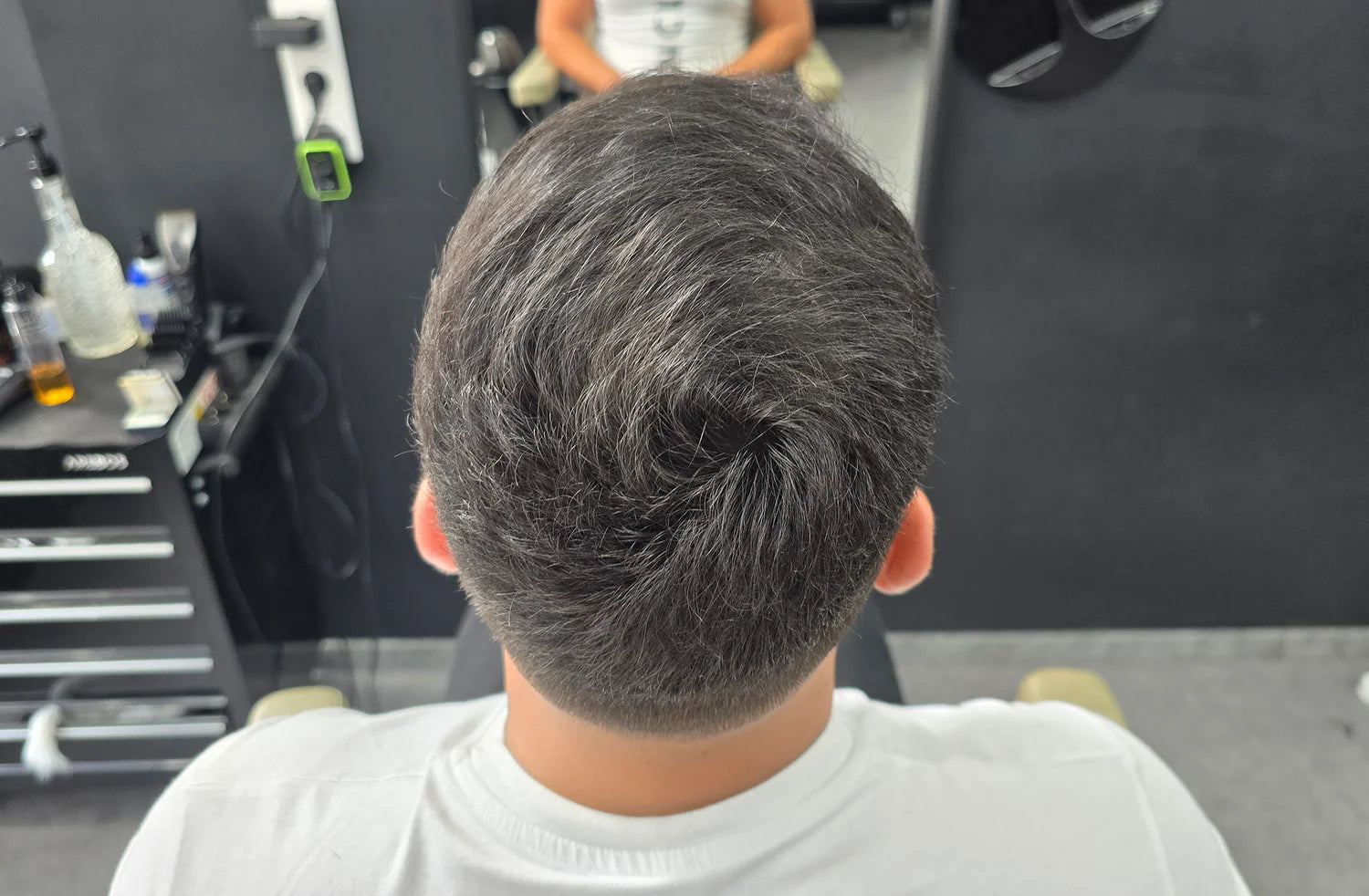 This is when the hair filler unfolds its full effect. It adheres to each individual hair, visibly filling it in and reliably concealing thinning areas such as a receding hairline or the beginnings of a tonsure.